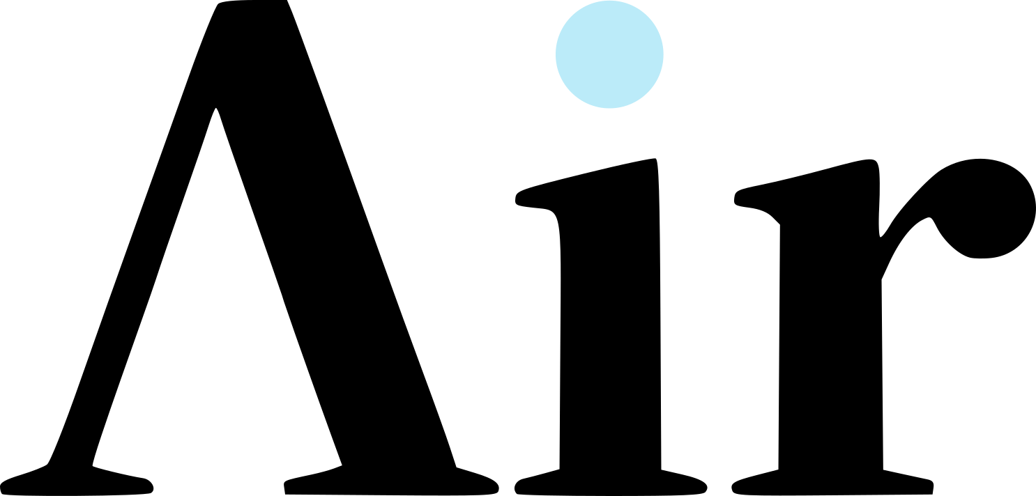 The Air logo combines an open A (no crossbar) with a floating blue dot above the i. The open A represents removal of unnecessary complexity. The floating dot is the air itself, passing through.